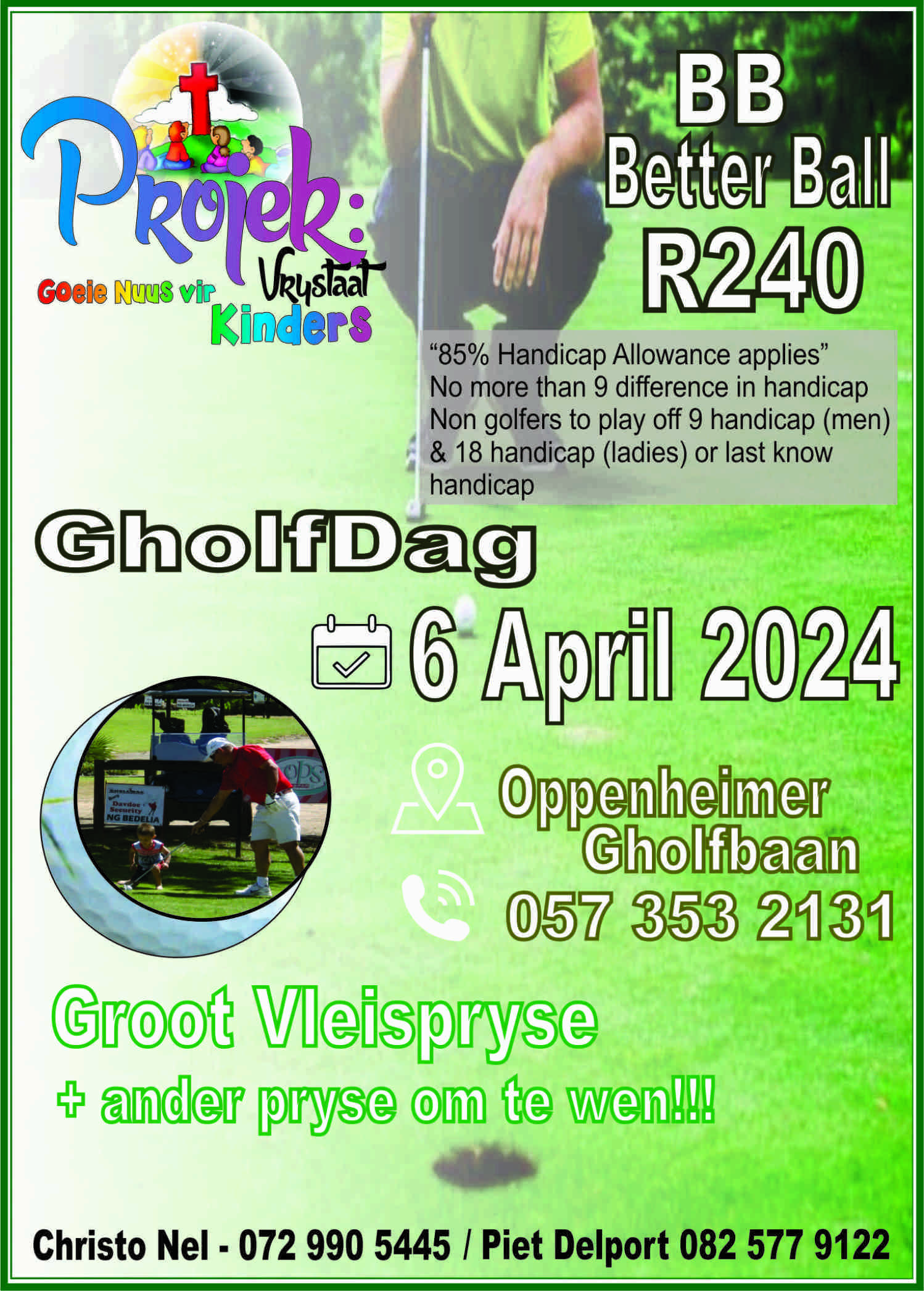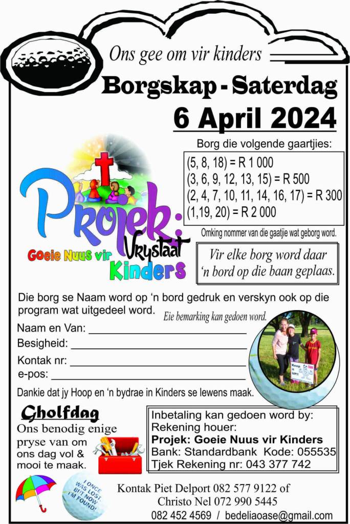 Navrae: Kontak Christo Nel (072 990 5445) of Piet Delport (082 577 9122) vir meer inligting oor die Gholfdag.