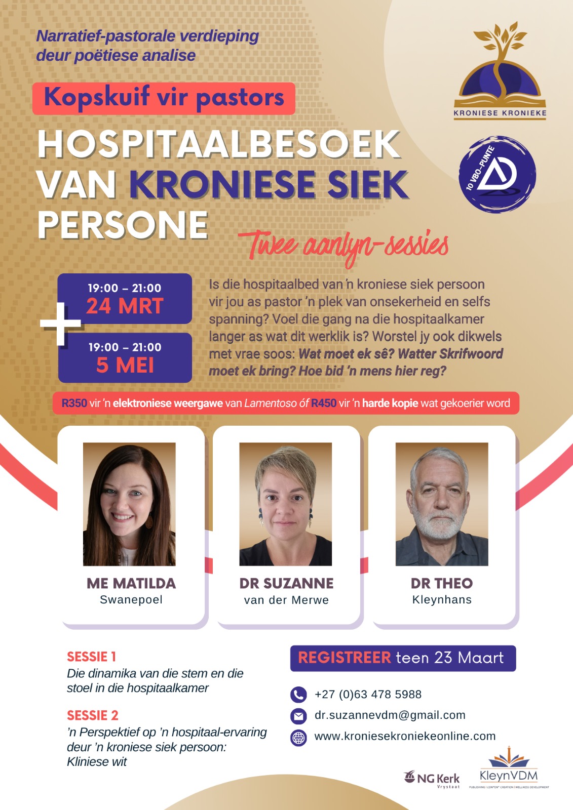 Twee aanlyn sessies van 2 uur elk met ʼn refleksie aktiwiteit (10 VBO-punte) aangebied deur dr. Suzanne van der Merwe, me. Matilda Swanepoel en dr. Theo Kleynhans met insluiting van: