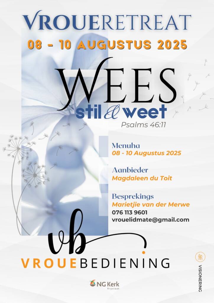 Plek: Menuha Retreatsentrum – 35 km buite Bloemfontein op die Brandfort-pad